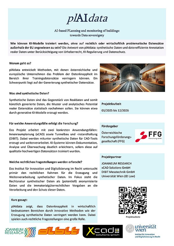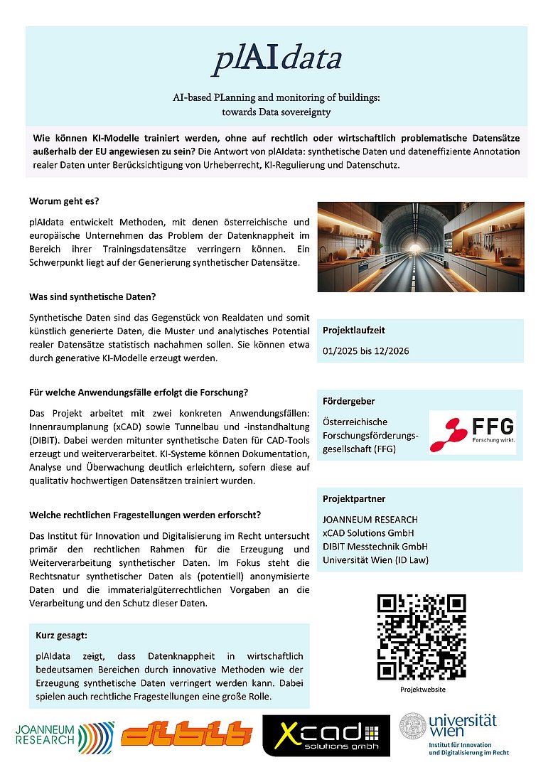 Participating companies include DIBIT Messtechnik GmbH, xCAD Solutions GmbH, the University of Vienna (Institute for Innovation and Digitalization in Law), and JOANNEUM RESEARCH DIGITAL, which is coordinating the project. Additionally, plAIdata is investigating legal issues related to data protection, copyright, and AI regulation and is developing guidelines for the legally compliant use of such datasets in Europe.