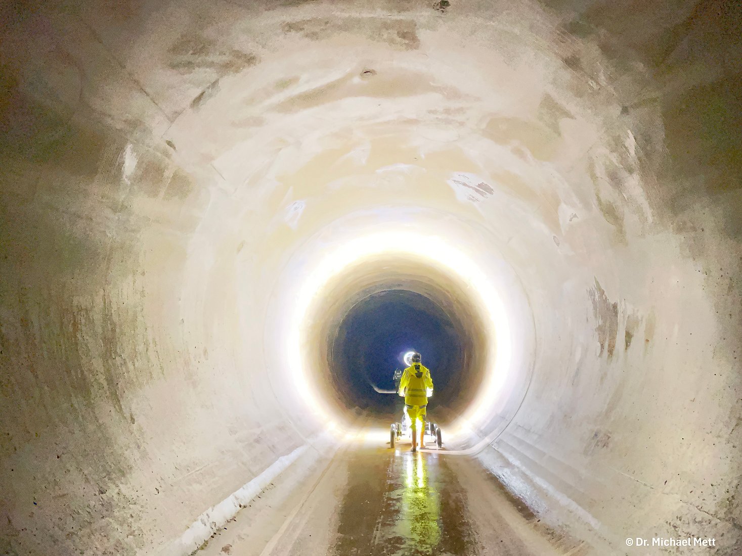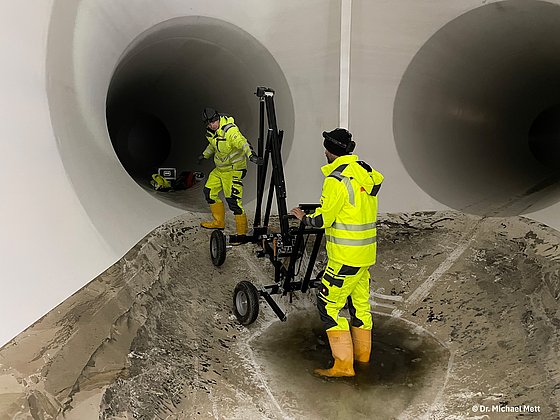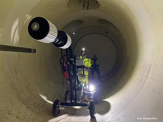 Zum Einsatz kam das Messsystem Dibit „Altira“, das mit 360-Grad-Rundumkameras ausgestattet ist und die gesamte Tunneloberfläche vollständig erfasst. Etwa alle 50 cm werden Bildaufnahmen erzeugt, die aufgrund der absoluten Dunkelheit im Tunnel mithilfe eines integrierten Blitzsystems aktiv ausgeleuchtet werden.